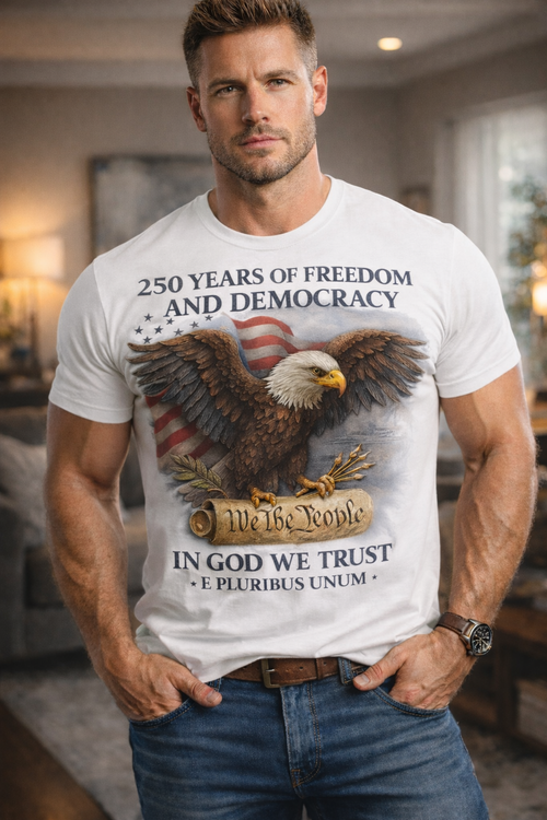 250 Years of Freedom and Democracy T-Shirt, U.S. 250th Anniversary Patriotic Eagle Tee, In God We Trust, Gift for Veterans & Americans